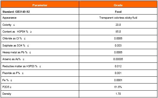Served as cleaner and acidity in food and drink; nutrient for yeast; and feedstock of phosphates (for food).